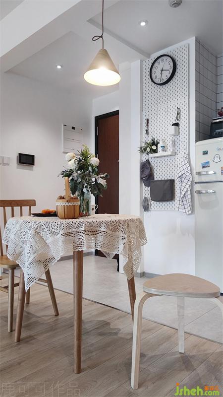 餐廳用的是溫潤(rùn)的木質(zhì)吊燈,搭配棉麻質(zhì)地的桌布,屋內(nèi)滿滿的日式溫馨氛圍,大面積的留白與純白的窗簾,不管是四季的任何一季都讓人很舒適,放松。