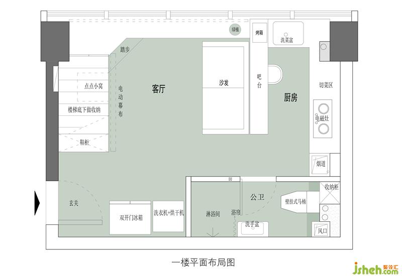 一樓規(guī)劃了玄關(guān),客廳、餐廚一體的開放式廚房、公衛(wèi)、樓梯下的儲物間。