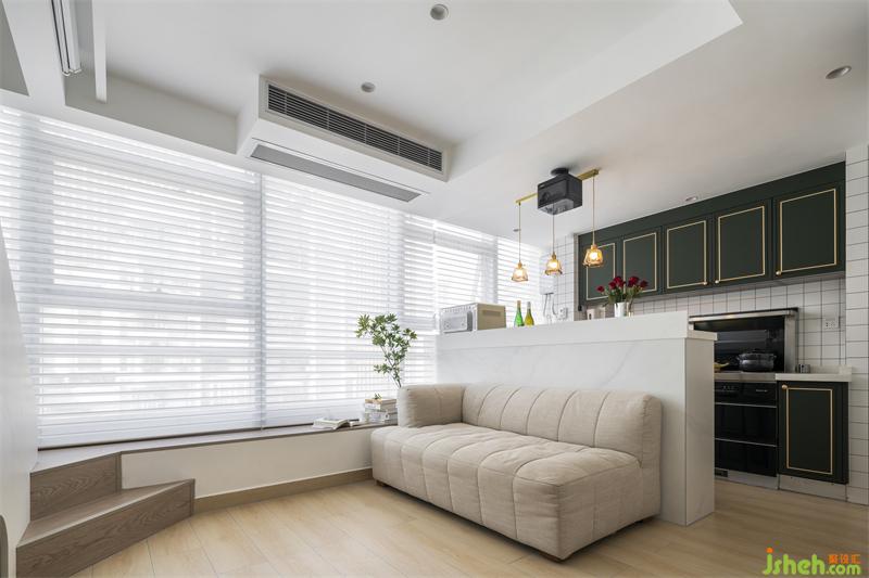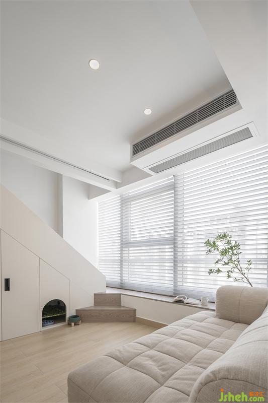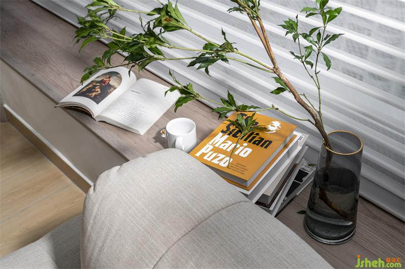 客廳的全景,整體是清爽的白色,窗簾用的是可調(diào)節(jié)光度的香格里拉簾,擁有百葉的同款美麗,卻比百葉更方便清理。當(dāng)光透過來映照出不同層次的光影,那一瞬間治愈感一定是強烈的。