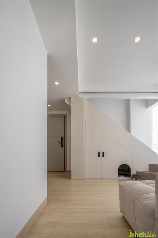客廳,沒有電視背景墻,用樓梯的結(jié)構(gòu)打造幾何造型,樓梯跟柜子結(jié)合成一個體塊,順延著樓梯間的柜門側(cè)面做了擋板,讓整個空間靈動有趣。