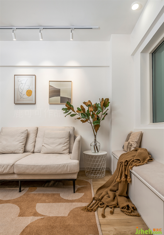 客廳沙發(fā)旁邊有一個承重柱,深度是420毫米,齊平柱子的厚度做了一個收納卡座,下面做了可以儲藏客廳收納物品的無把手抽屜,由于空間的限制客廳沒有擺放單人位,長度達2米的卡座可兼顧朋友聚會時坐。
