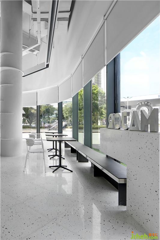 吧臺和制作輕食的半開放廚房被安排在室內(nèi)唯一的墻面區(qū)域,室內(nèi)桌椅的擺放根據(jù)異形的室內(nèi)空間及其動線,散而有序的分布。餐廳設(shè)計