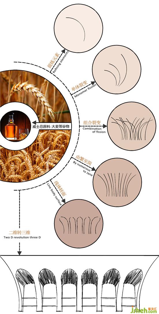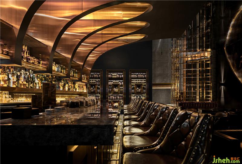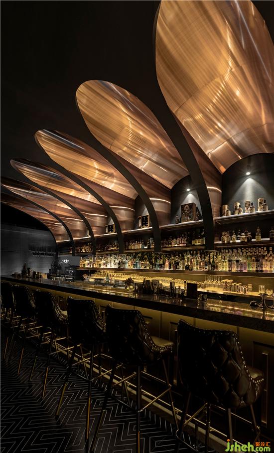 概念源自于制作威士忌的原料(大麥),本空間以“大麥”為主要提煉元素,先由單一的自然形態(tài)到組合裂變形態(tài),再由“繁”至“簡(jiǎn)”轉(zhuǎn)換形態(tài)并植入到以酒吧中部為核心的主酒架區(qū)域,突出為之相聯(lián)的主題。泛金色的金屬質(zhì)感融入到整體空間中,進(jìn)一步體現(xiàn)威士忌的固有色,并在燈光的映射下顯得流光溢彩,光影之間猶如半畝方塘一鑒開(kāi),天光云影共徘徊。酒吧設(shè)計(jì)