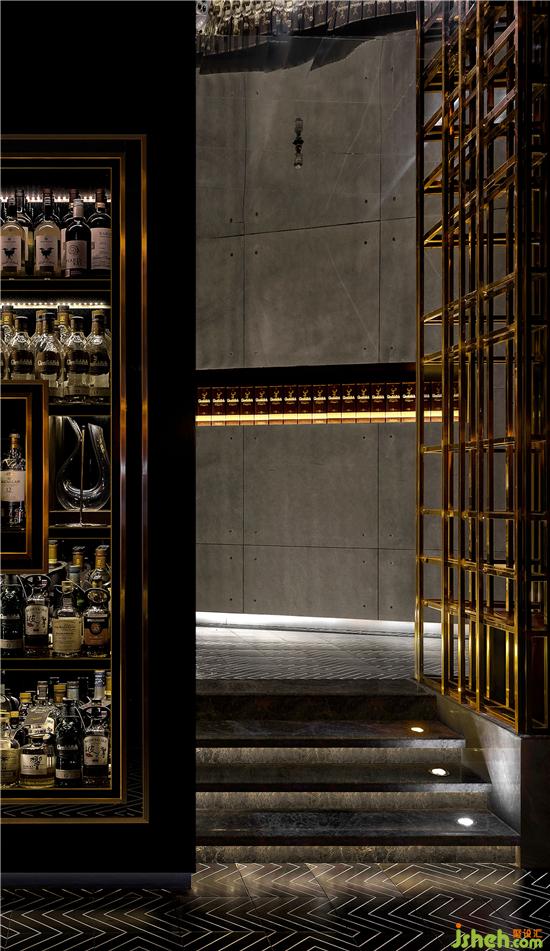 在整個(gè)空間的視覺(jué)上以黑/金色為主基調(diào),營(yíng)造一種神秘的高貴感。黑/金色的搭配與碰撞一直是時(shí)尚界的寵兒。黑色,作為一個(gè)強(qiáng)大的色彩,它可以很莊重也可以很高雅,是一種具有代表多種不同文化意義的顏色。金色是金屬金的顏色,具有光澤,它是大自然中至高無(wú)上的純色,象征太陽(yáng)的顏色,代表著溫暖與幸福。本空間的金色概念更多的是為了體現(xiàn)威士忌酒本身的固有色,在不同的燈光呈現(xiàn)下映射出不同的金色,也如同表達(dá)一種不同年份的威士忌酒該有的色彩。