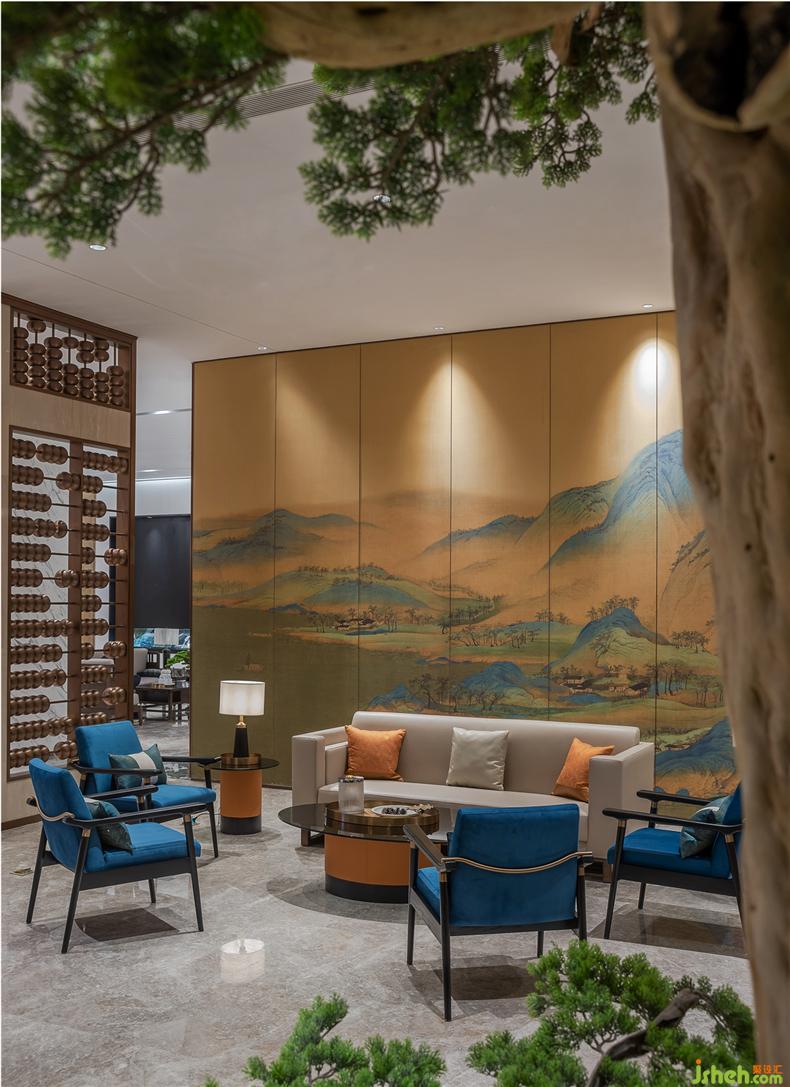 本案設(shè)計以宋朝的文化意識形態(tài)和思想價值為主題核心,通過宋代大師王希孟所作的十大傳世名畫---《千里江山圖》勾勒整體設(shè)計的創(chuàng)作靈魂,于不同樓層之間細(xì)化主題和融入宋詞、書法、花鳥、瓷器、交子等設(shè)計元素,《千里江山圖》丹青千里,裝修設(shè)計咫尺亦有千里之趣,以長卷形式描繪了連綿的群山岡巒和浩渺的江河湖水等,描繪精細(xì),意態(tài)生動,把祖國山水的雄奇和壯麗揮灑出了一種雄渾、豪邁的氣魄,從中寓意新東方村鎮(zhèn)銀行未來藍(lán)圖千里江山的宏愿,在最美的年華繪制最美的圖卷。