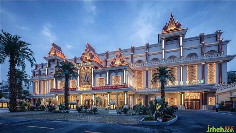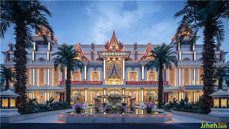 溫泉酒店的建筑外形仿照泰式大皇宮建筑風(fēng)格,酒店設(shè)計(jì)在泰國(guó),他們非常注重綠化在環(huán)境中的作用,注重對(duì)小環(huán)境的建設(shè),因此我們圍繞整個(gè)建筑主體種植了許多棕櫚樹和其他熱帶植物,在搖曳著棕櫚樹的花園式庭園中,在恢弘中夾雜著熱烈的風(fēng)情。