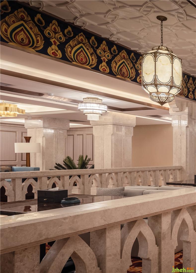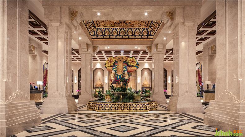 大堂是一派穩(wěn)健知性的祥和恢弘,霸氣側(cè)漏的石柱分布在整個(gè)空間,讓空間頓時(shí)充滿力量感, 最?yuàn)Z人眼簾的便是石柱圍繞著的多彩鮮艷昂首邁步的大象雕塑,矗立在大堂中央立體感十足,似是緩步而行,被精致雕飾的孔雀眼環(huán)繞,在大堂中具有點(diǎn)睛效果,泰國(guó)素有“白象之國(guó)”之稱,大象很受東南亞一些國(guó)家的尊重,被奉為國(guó)獸,酒店設(shè)計(jì)仿若坐鎮(zhèn)酒店的神獸。石柱、大象、孔雀、金色、繁雜精細(xì)的雕刻技藝無(wú)不彰顯著與眾不同,皇家朝廷氣派側(cè)漏。
