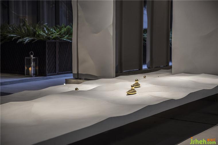首先,因為餐廳60%左右的經(jīng)營面積位于傳統(tǒng)概念中的B2層。在設(shè)計解決中,我們在中庭做了一個下沉廣場直接通到B2層,龍庭酒家設(shè)計在這樣情況下B2層很房間是沒有自然采光的,怎么讓客人在就餐時能夠忽略這個位置問題,這是第一個難點。