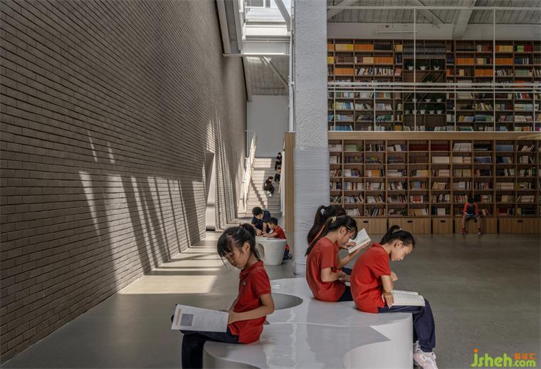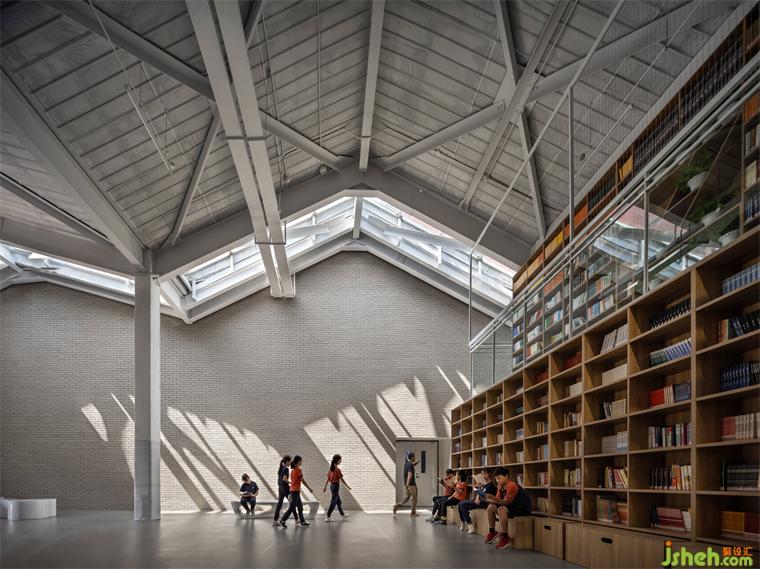 所有教學(xué)空間圍繞兩個大型中庭展開:入口中庭更像一個開放式的圖書館,雙層書架的靈感來源于600多年前的牛津圖書館。演講廣場中庭既連接上下兩層,也延伸了教學(xué)空間,同時,甚至公共的演講也可以在這里展開。學(xué)校裝修設(shè)計屋頂散布的多個天光,一起讓整體建筑靈動而明亮,上下自然聯(lián)通,呈現(xiàn)出動態(tài)的內(nèi)部空間。