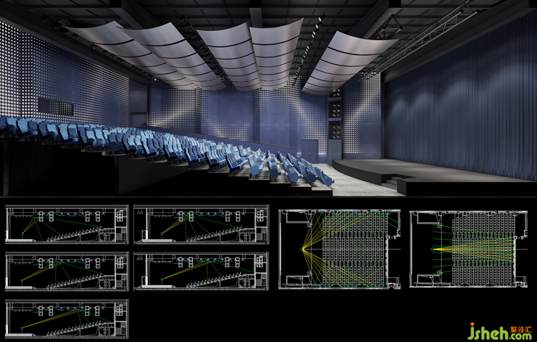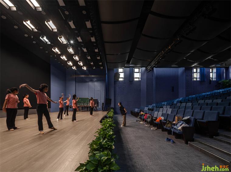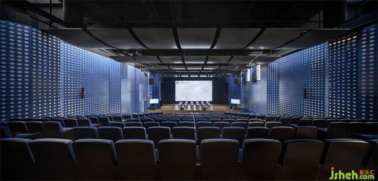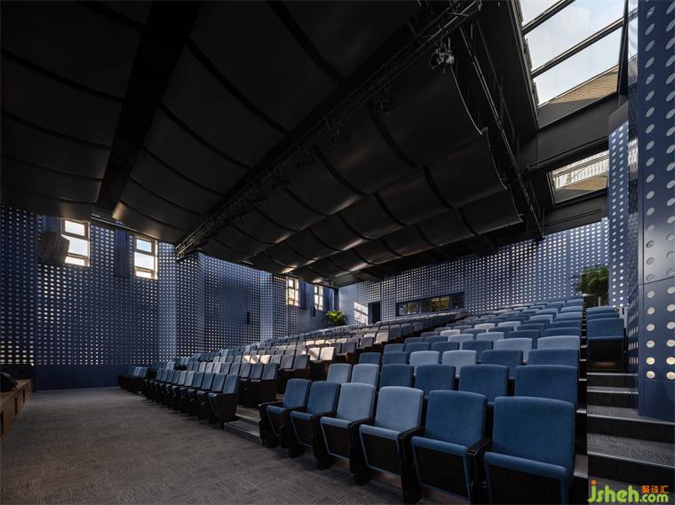 在倉庫空間里支起活動鋼架,使這里可以作為一個300座的階梯式報告廳。這個功能性空間以聲學(xué)設(shè)計為導(dǎo)向:學(xué)校裝修設(shè)計空中懸掛的導(dǎo)聲板力圖讓空間里的每位學(xué)生有幾乎相同的音質(zhì)體驗(yàn)。同時,墻身上的孔洞既達(dá)到吸聲功效,其特殊的參數(shù)化設(shè)計圖形也呼應(yīng)了正澤學(xué)校精神層面“澤”為“水”的意象。
