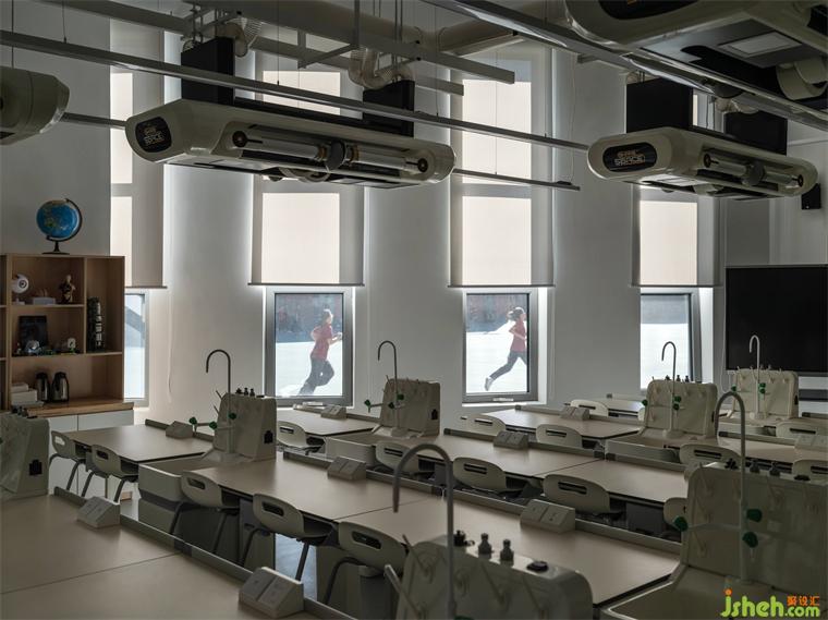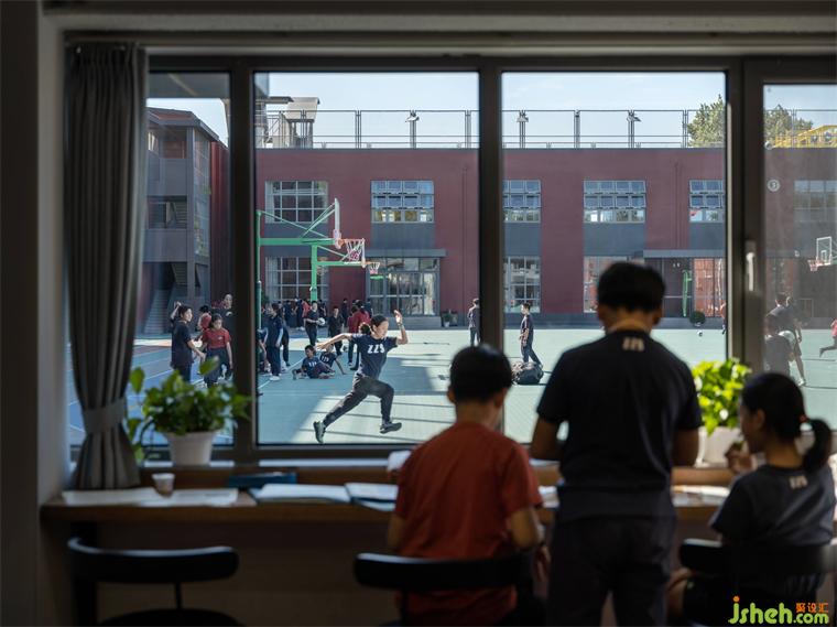 教室空間的設(shè)計(jì)以“適于學(xué)生開(kāi)展各種能動(dòng)、自主的學(xué)習(xí)活動(dòng)、少教多學(xué)”為主要目標(biāo),倉(cāng)庫(kù)打開(kāi)條形窗后,燈光與自然天光照進(jìn)教室,這在高密度的都市校舍中顯得格外珍貴。