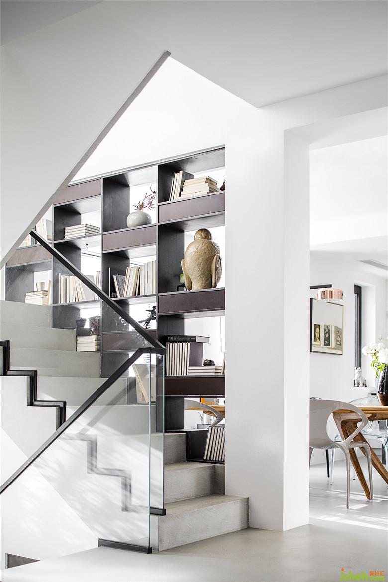 大面積納米水泥的運用,高級的灰色塑造出大氣而連貫的空間;定制的銹濁工藝金屬書架,從一樓延伸至地下一層,讓兩層空間緊密相連。