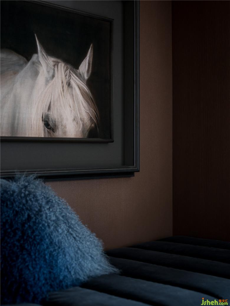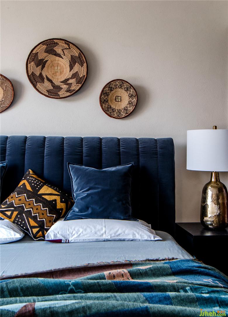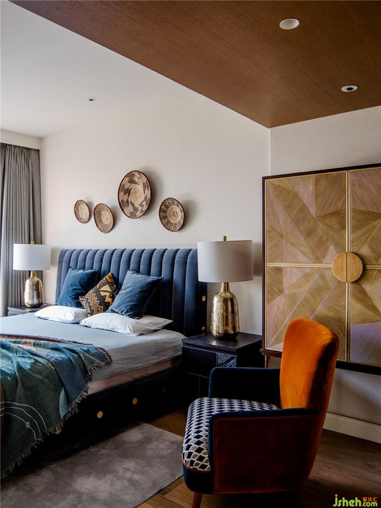 床頭的手工制品,工藝精湛,歷久彌新,搭配深藍(lán)色天鵝絨材質(zhì)的床,再添一把橙色的扶手椅,賦予空間一種優(yōu)雅又異域的氛圍。
