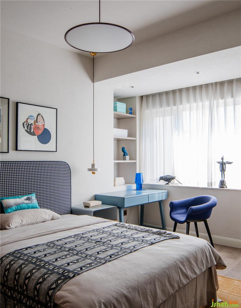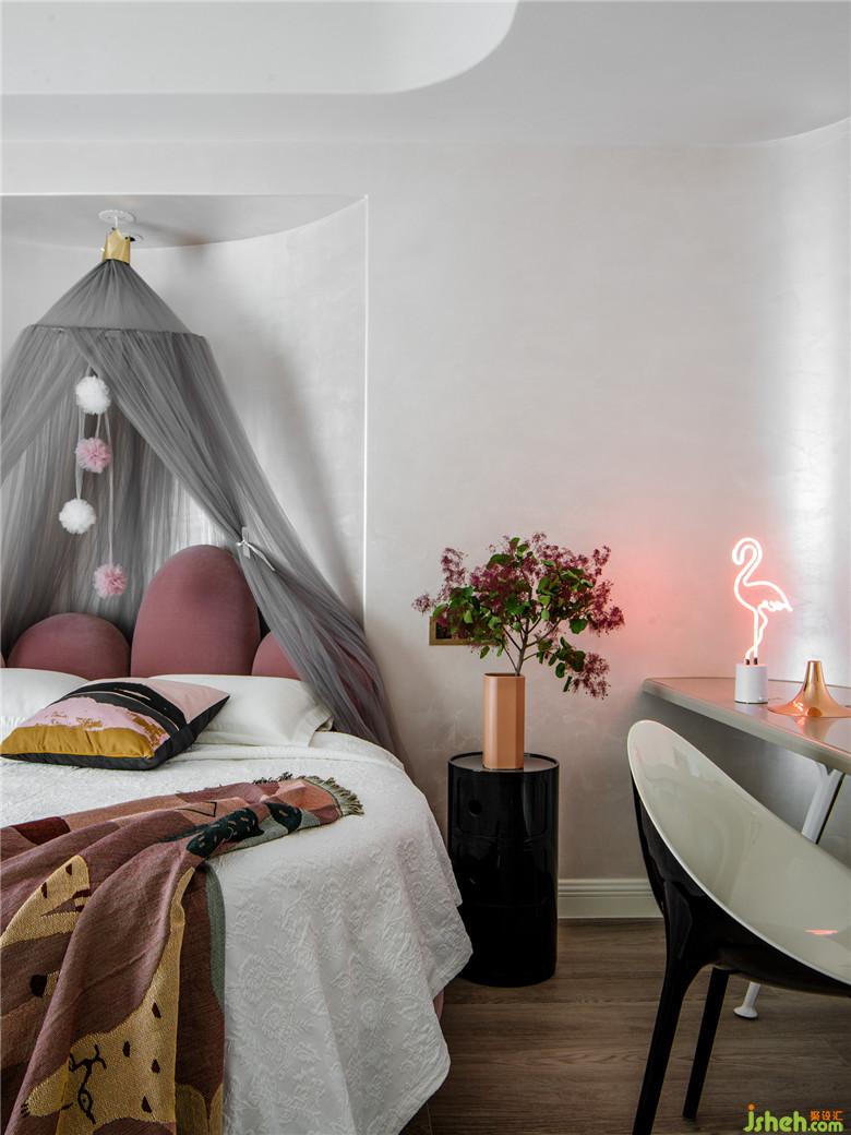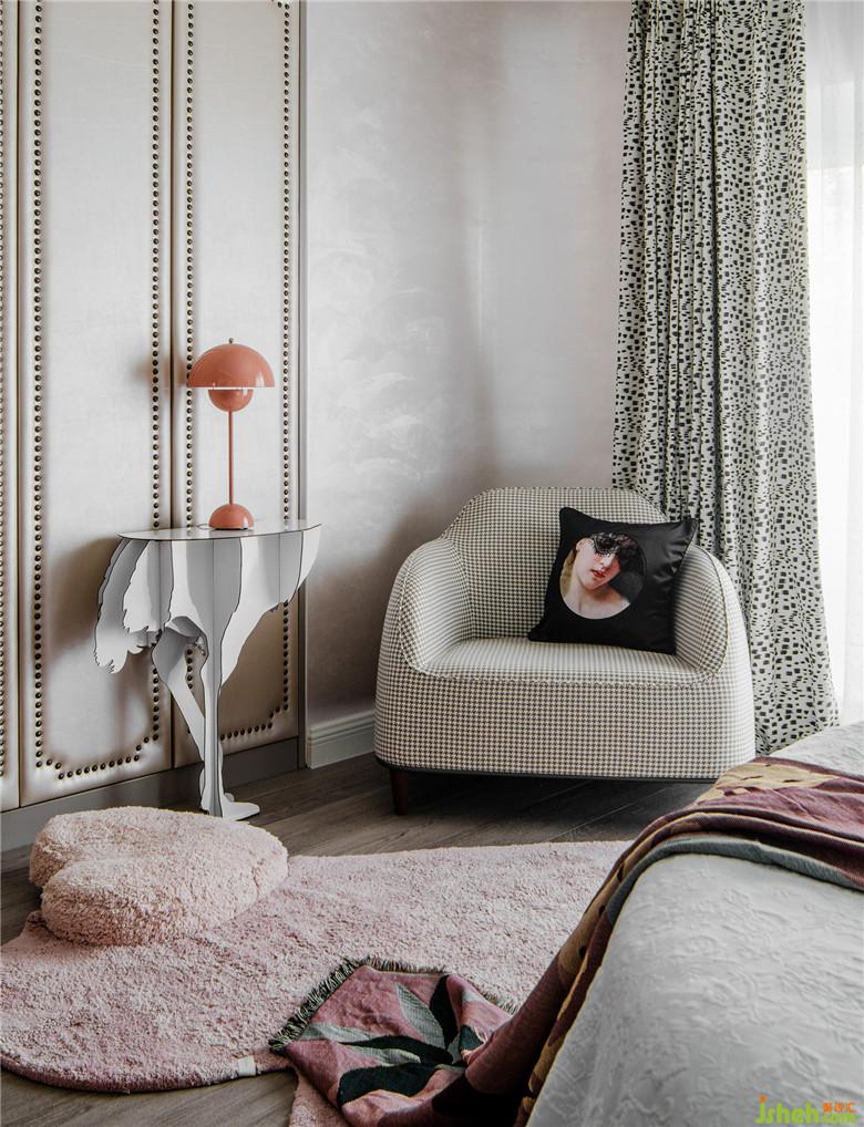 墻角的弧線處理與陽(yáng)臺(tái)呼應(yīng),一氣呵成,很簡(jiǎn)約的細(xì)節(jié)設(shè)計(jì)對(duì)房間的采光有著意想不到的效果。相比白墻,藝術(shù)漆肌理墻面可以將物品的光彩放大。皮粉色的床和地毯,為空間賦予個(gè)性和溫度。