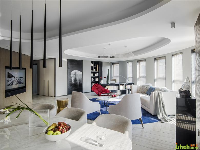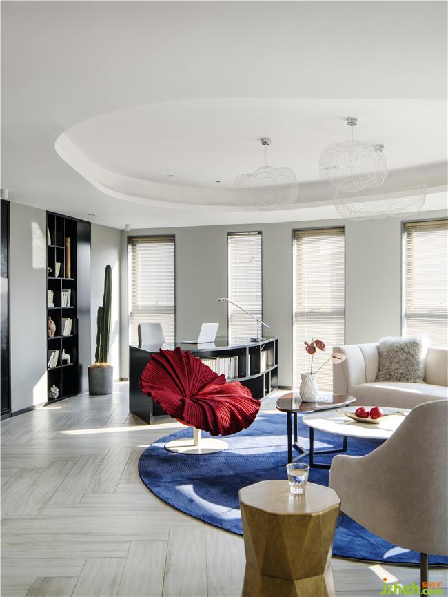 由玄關(guān)移步至室內(nèi)會(huì)有一種「異常開(kāi)闊」的感覺(jué),六大扇兼具現(xiàn)代感與藝術(shù)感的條形落地窗一字排開(kāi),三里屯SOHU特有的弧形結(jié)構(gòu)讓空間感進(jìn)一步延伸, 從這里可以俯瞰窗外繁華的街道。