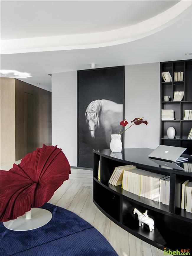 溫潤的弧形辦公桌與弧形的空間形成呼應(yīng),外嵌至辦公桌上的書架和內(nèi)嵌至墻面的書架上的書本,給空間一種連貫的語言,高低錯(cuò)落間這些書本成為了漂亮的裝飾品。