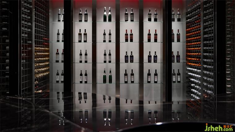 全透明玻璃的恒溫酒室里,安裝了設(shè)計(jì)團(tuán)隊(duì)特別定制的酒品陳列架,正面使用玻璃層板進(jìn)行展示陳列,側(cè)面則使用不銹鋼格架進(jìn)行儲(chǔ)存。