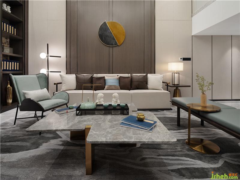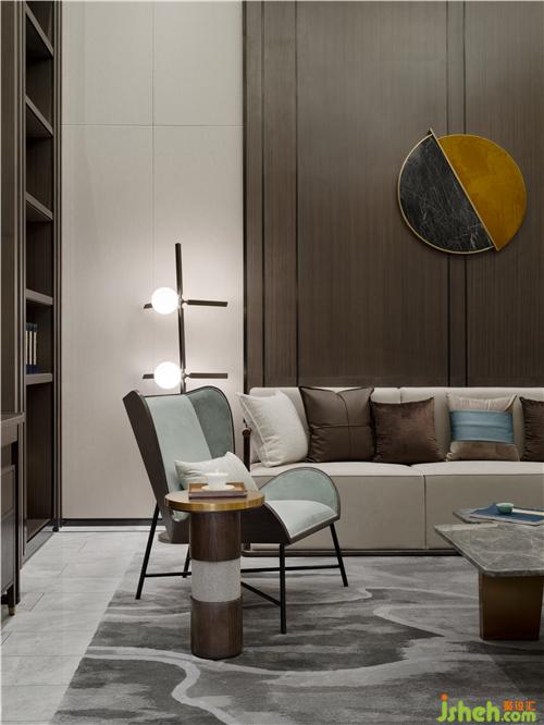 無論是從其呈現(xiàn)的風(fēng)格美學(xué),還是賦予人的極致體驗,呂邵蒼設(shè)計在人文生活情景上的深度打磨都值得贊嘆。在負(fù)二層會客廳,設(shè)計師賦予空間場景以靈動的詩意 —— 一池春水匯于線條蜿蜒的捫布之上,與蒼翠的松樹端景、不規(guī)則走線的雅灰地毯形成虛實的映襯,以一種返璞山水與林間的自然意境,實現(xiàn)私密會客、親朋暢聚的休閑空間。
