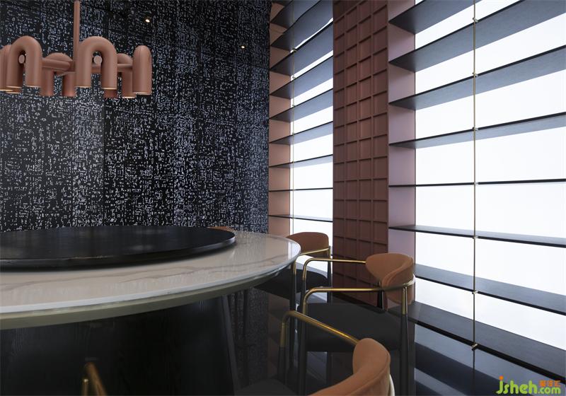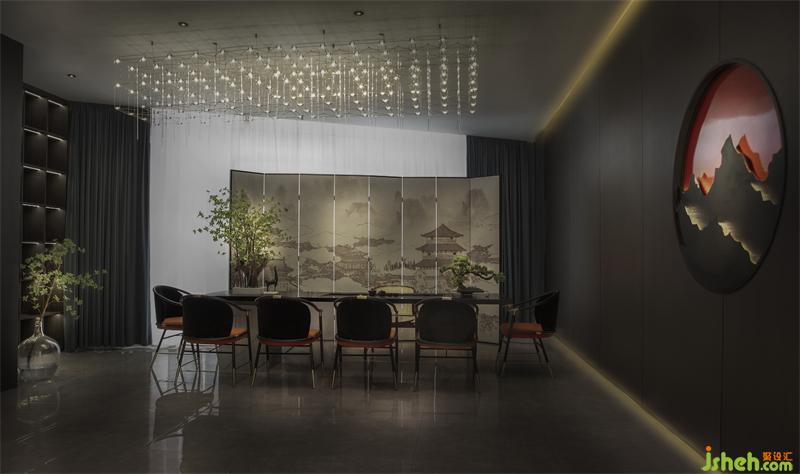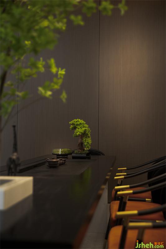 JUN用現(xiàn)代的材料與傳統(tǒng)的設(shè)計(jì)元素來(lái)演繹出富有建筑的古樸和端莊,也表現(xiàn)出一派安靜而祥和的景象,品茶區(qū)背景的折疊屏風(fēng)借鑒了輞川圖的山水建筑,墻面的造型提取了山的元素,通過(guò)現(xiàn)代的材料跟藝術(shù)裝置的手法來(lái)表現(xiàn),形成獨(dú)特的空間體驗(yàn)。