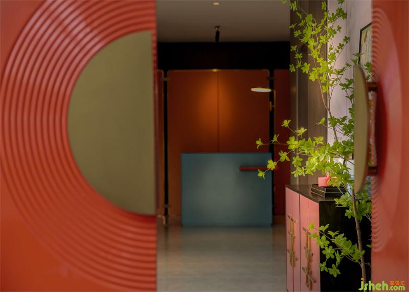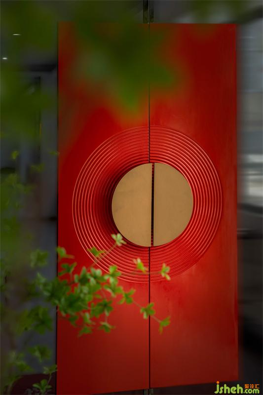 朱砂漆大門(mén)通過(guò)一種更加自然質(zhì)樸的東方美學(xué)方式同時(shí)融合典雅輕奢的黃銅拉手,重新定義奢華和富饒。前臺(tái)區(qū)的懸掛式臺(tái)燈一束柔光,將人們的視線引向這個(gè)亮點(diǎn)突出的視覺(jué)效果從而增加了空間和物體的立體感。The door with cinnabar lacquer redefines luxury and richness through a more natural and simple oriental aesthetic method while integrating elegant, light and luxurious brass handles. In the hanging desk lamp in the front desk area, a beam of soft light leads people's eyes to this bright spot, which enhances the three-dimensional sense of space and objects.