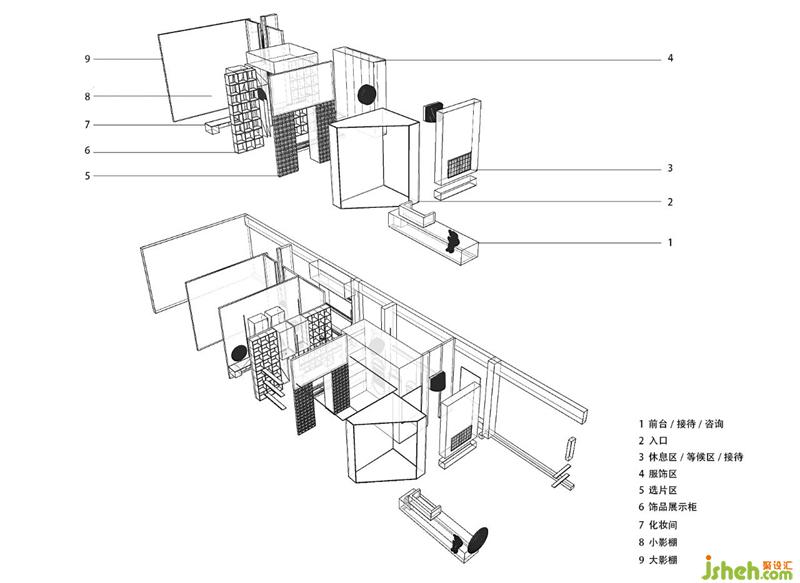 然而挑戰(zhàn)隨著到來,畢竟在150平米的小店內(nèi),規(guī)劃出10個功能分區(qū),每個分區(qū)的功能還要有足夠的空間滿足顧客的體驗。這種情況下,很容易給客戶帶來不好的體驗,所以在保證必要獨立功能的同時,重疊功能,借用過道分區(qū)的公共空間來做婚紗禮服展示。在兼具功能使用的同時,又不影響到過道的動線,從接待,等候休息,再到飾品道具,服裝,化妝造型的選擇最后進(jìn)行拍攝,選片。整體的空間動線都圍繞著這拍攝流程來展開的。