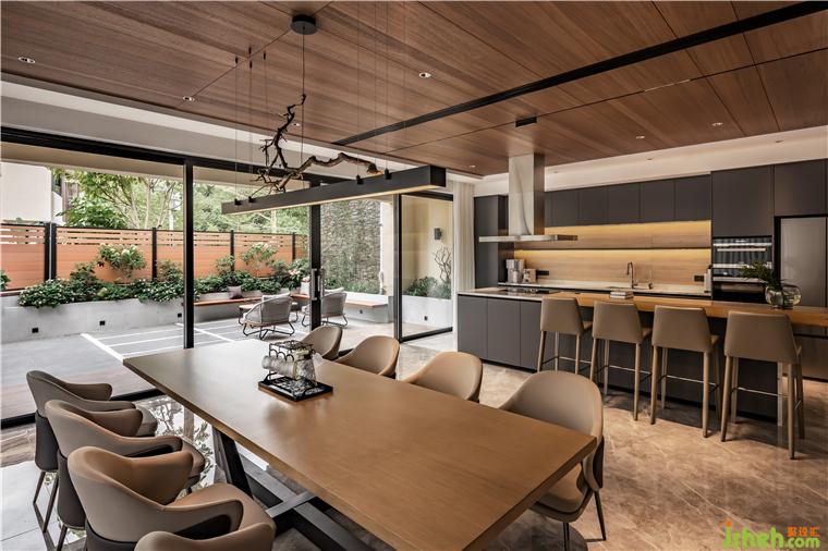 負(fù)一層為主人接待友人和家庭娛樂(lè)的空間,開放式的西廚與用餐區(qū)形成很好的社交屬性,并穿插天花天然木紋的質(zhì)感表達(dá),佛山保利云上別墅裝修設(shè)計(jì)讓餐廚空間自成一體,深淺色塊的碰撞讓空間不止是使用,而是另一種視覺(jué)的享受。