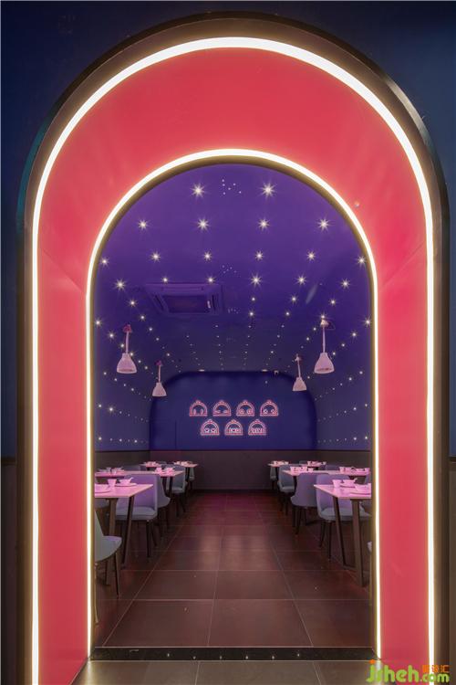將抽象的品牌概念,轉(zhuǎn)化為可感知、可傳播的空間語言,并為商業(yè)經(jīng)營增加效益,是本案設(shè)計(jì)思考的核心。故而在門頭設(shè)計(jì)上,室內(nèi)設(shè)計(jì)師運(yùn)用了極具建筑感的形象,在不同方位立體化地展現(xiàn)“味”與“未來”。大膽鮮明的色彩布置,讓餐廳設(shè)計(jì)成為街道靚麗而醒目的存在。VIVI的卡通化IP形象不僅可以作為賣點(diǎn)吸人眼球,還可以形成自己的視覺符號,增加品牌的辨識度。