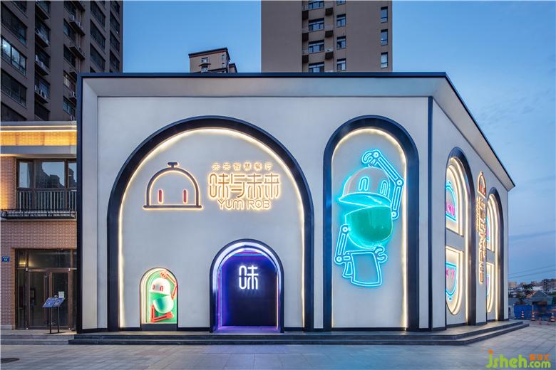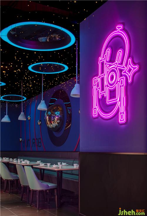 用餐區(qū)域提取品牌形象、未來(lái)感作為貫穿整個(gè)空間的元素,藉由天馬行空的設(shè)計(jì)手法對(duì)原有的空間進(jìn)行了重新解讀。未來(lái)新科技元素的設(shè)計(jì),擺脫了傳統(tǒng)餐廳設(shè)計(jì)的一成不變的沉悶感,置身其中仿佛漫步在未來(lái)時(shí)空。頂面的圓形鏡面與發(fā)光體的結(jié)合,營(yíng)造相對(duì)靜謐舒緩的區(qū)域,賦予整個(gè)空間一種深邃的氛圍感。