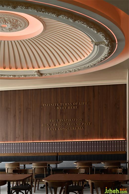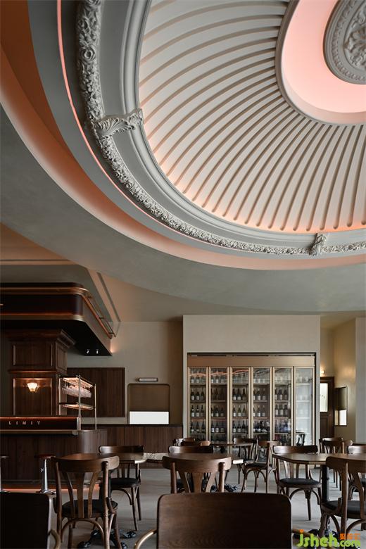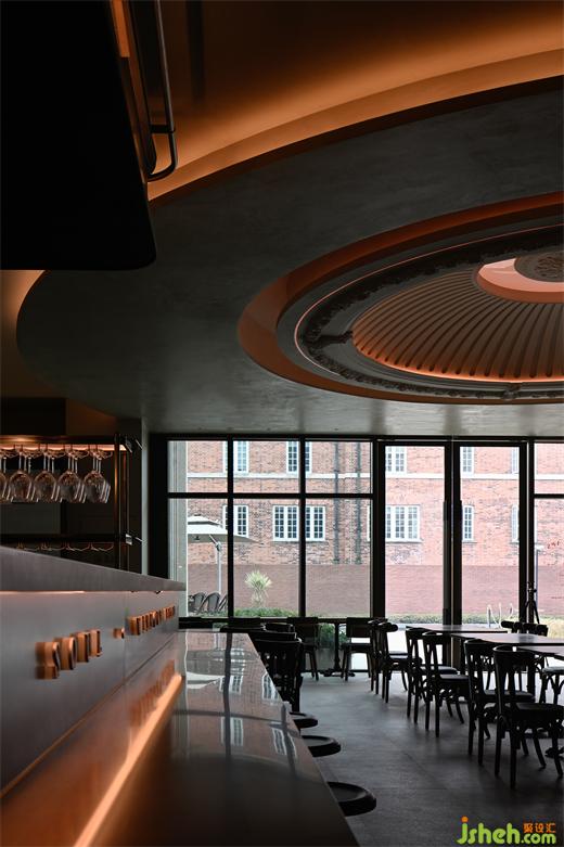 當(dāng)暮色余暉自落地窗角消散,晚間特有的燈光恰如日光與月色的輪轉(zhuǎn),映照出區(qū)別于日間的溫柔。餐廳設(shè)計(jì)采取日咖夜酒的經(jīng)營(yíng)模式,為消費(fèi)者在不同時(shí)段提供了更豐富的選擇。藍(lán)色的穹頂光與西方藝術(shù)中罕見(jiàn)的滿(mǎn)月相對(duì)應(yīng),將古典文學(xué)語(yǔ)境下的詩(shī)意與美感具化于現(xiàn)實(shí)。