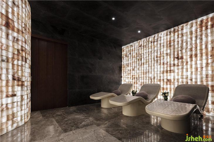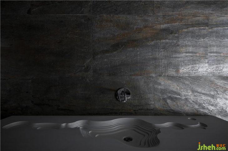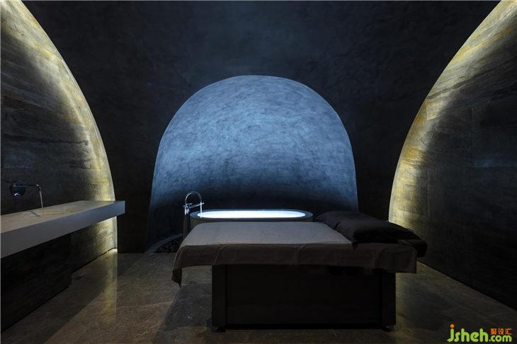 他將SPA區(qū)的設(shè)計原型定為地底溶洞,以深邃懸浮的震撼自然之景打造室內(nèi)空間,塑造出有形立體的混凝土立面。曲線雕刻的立面形體持續(xù)延伸,深沉地“懸?!庇诘孛嬷希彰饔衷鰪娏诉@種建筑張力,猶如置身溶洞。