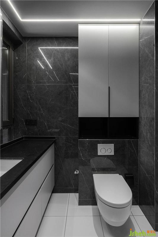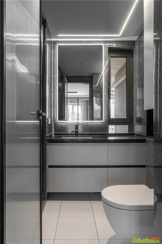 這是一個科技感十足的衛(wèi)生間,與臥室之間選用了長虹玻璃隔斷,墻壁采用黑白大理石瓷磚配灰色柜子,易于打理的同時使整個空間更具未來感更顯高級。
