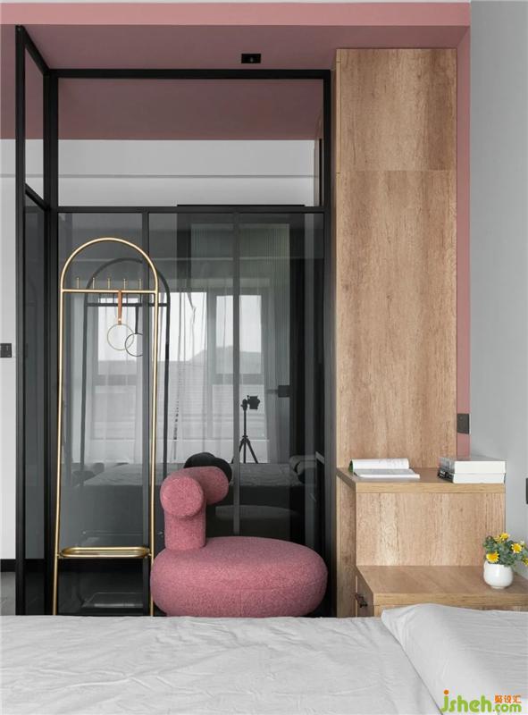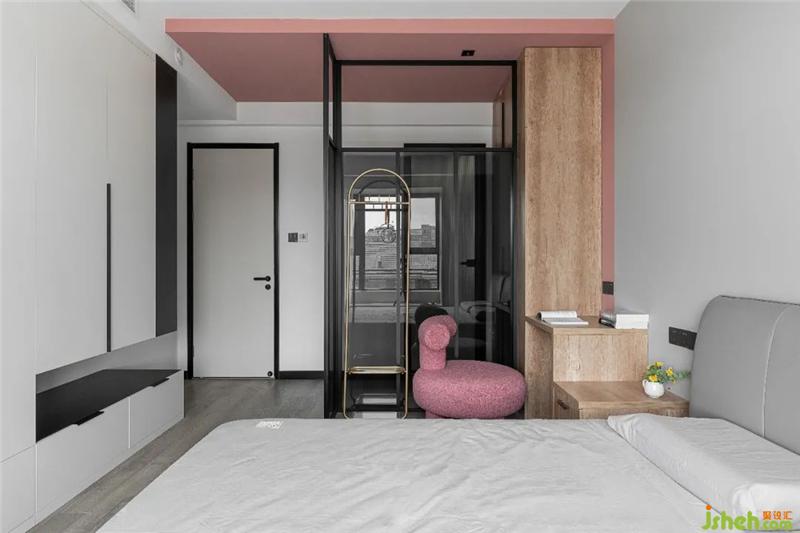 墻面采用木飾面與灰色乳膠漆拼接,頂面粉色色塊吊頂,和粉紅色的小座椅相呼應(yīng),讓空間更有活力,學(xué)習(xí)桌和床頭柜的功能合為一體,高度在650mm,方便使用又美觀。