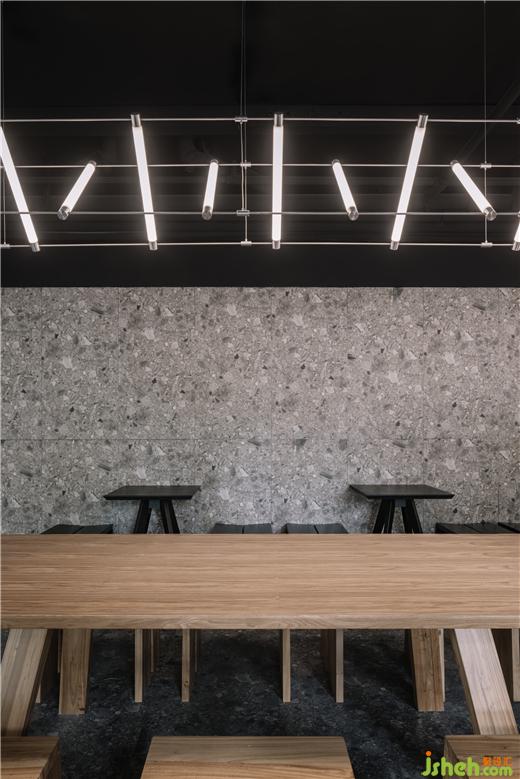Externally, the exterior walls are painted with a light textured coating, freeing the dining room from the old red textured building, and framing the boundary between old and new. The dilapidated doors and windows of the original facade have been replaced with more permeable folding windows. The black steel plate winds up and down, separating the solid wall from the transparent glass windows and becoming the building's new facade. The upper part of the steel plate formed window frames, while the lower part of the steel plates became outdoor chairs. Folding windows on the facade and outdoor seating enhance the restaurant's connection to the street.