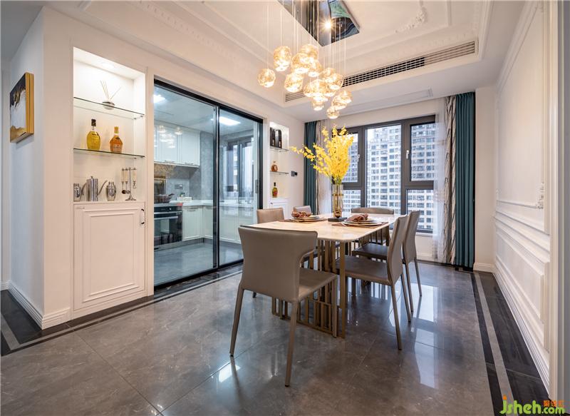 餐廳不再需要傳統(tǒng)的邊吊和射燈,如夢幻泡沫般的玻璃藝術(shù)吊燈,一樣可以滿足空間照明,日落黃昏時的晚餐會更顯得有浪漫情調(diào),嫩灰色的餐椅、亮黃色的花卉。地面選用灰度太陽石系列瓷磚,搭配經(jīng)典黑大理石瓷磚走
