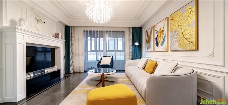 干凈優(yōu)雅的色彩基調(diào)搭配白色調(diào)的壁爐下與黑色電視機柜,顯得簡潔而雅致。深色的單人椅呼應(yīng)著空間中的灰度,光線透過紗簾灑進室內(nèi),使得米色沙發(fā)顯得格外溫馨和舒適。