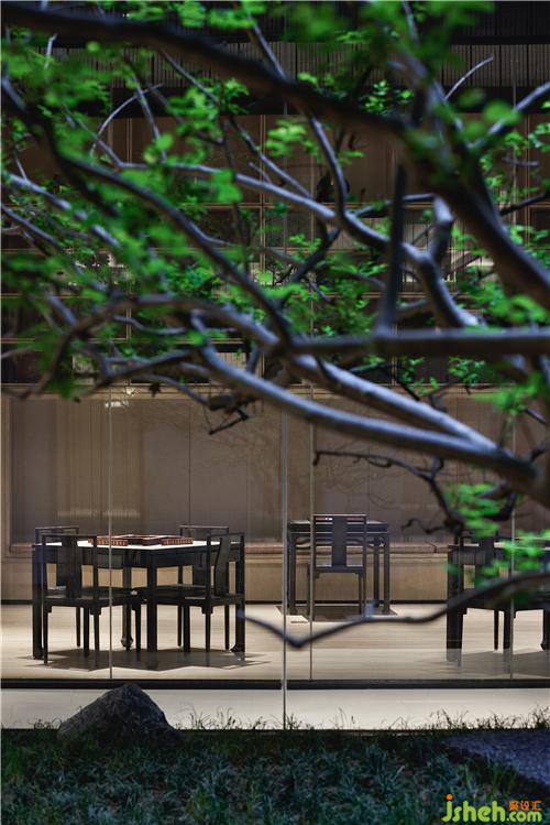茶室隔窗輝光,空靈清妙。其內(nèi)長桌后,是扇朦朧隔光玻璃軒窗,使得庭院花葉隔簾生輝。握杯靜坐,俗念消融在那如月如鶴翼的淡白輝光里,物我兩忘。