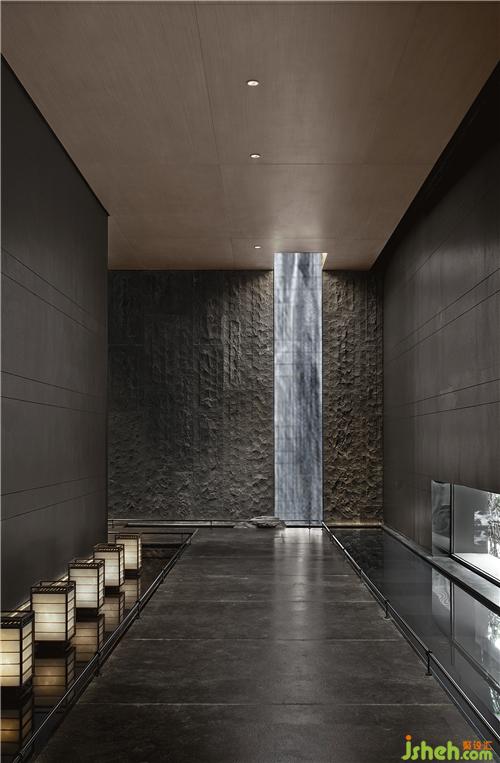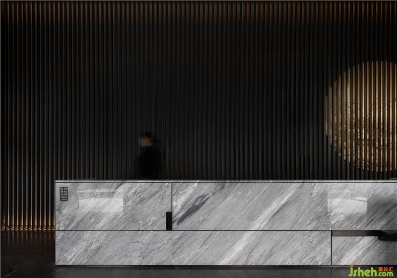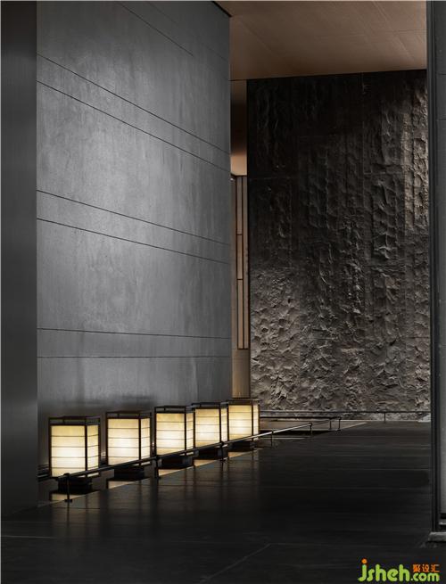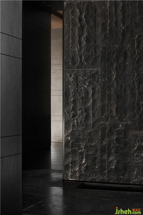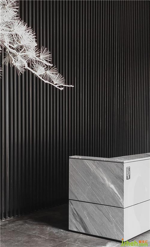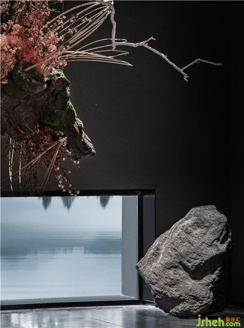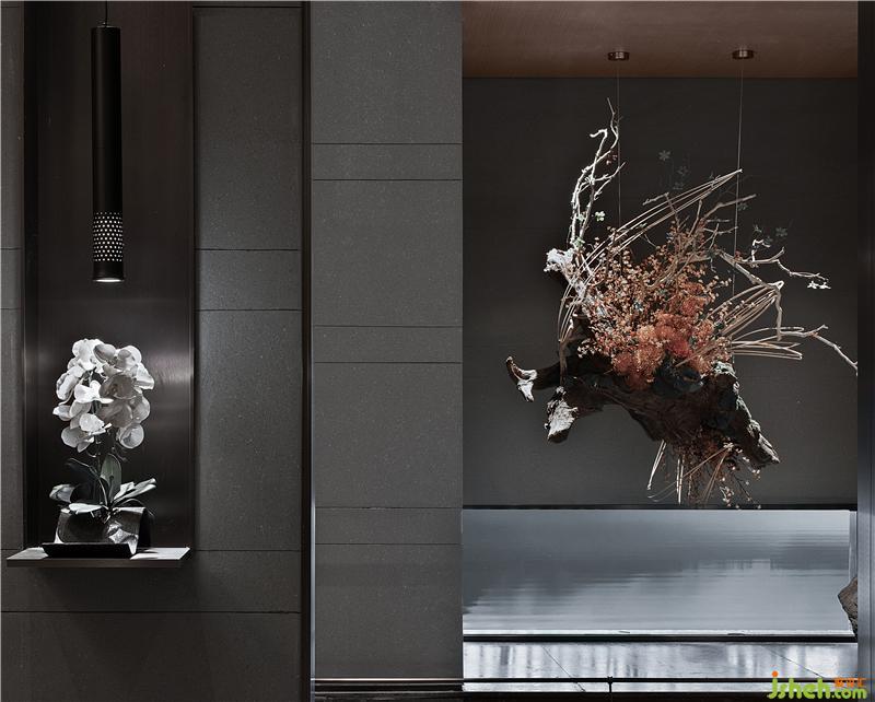 墻面以簡(jiǎn)素低調(diào)的深色材質(zhì)大面積鋪陳,空間上方斜枝一株白松,松枝的樹影映輝著墻面,樹影婆娑,雖由人作,宛自天成。