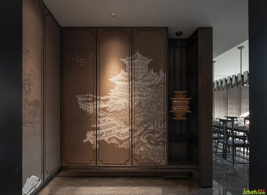 初入玄關(guān),一副清朝九成宮圖軸將雅韻的東方藝術(shù)氣息引入室內(nèi)。華燈初上,介于方寸之間,盡享乾坤,以此體現(xiàn)傳統(tǒng)住宅建筑“藏風(fēng)納氣”的居住理念。
