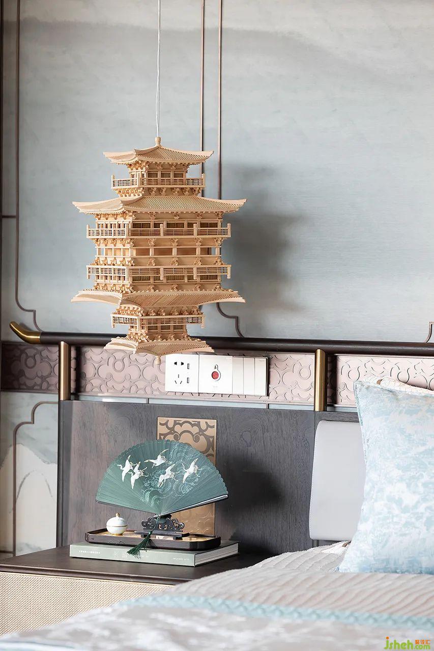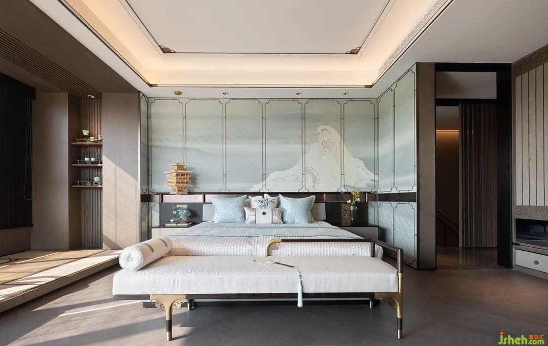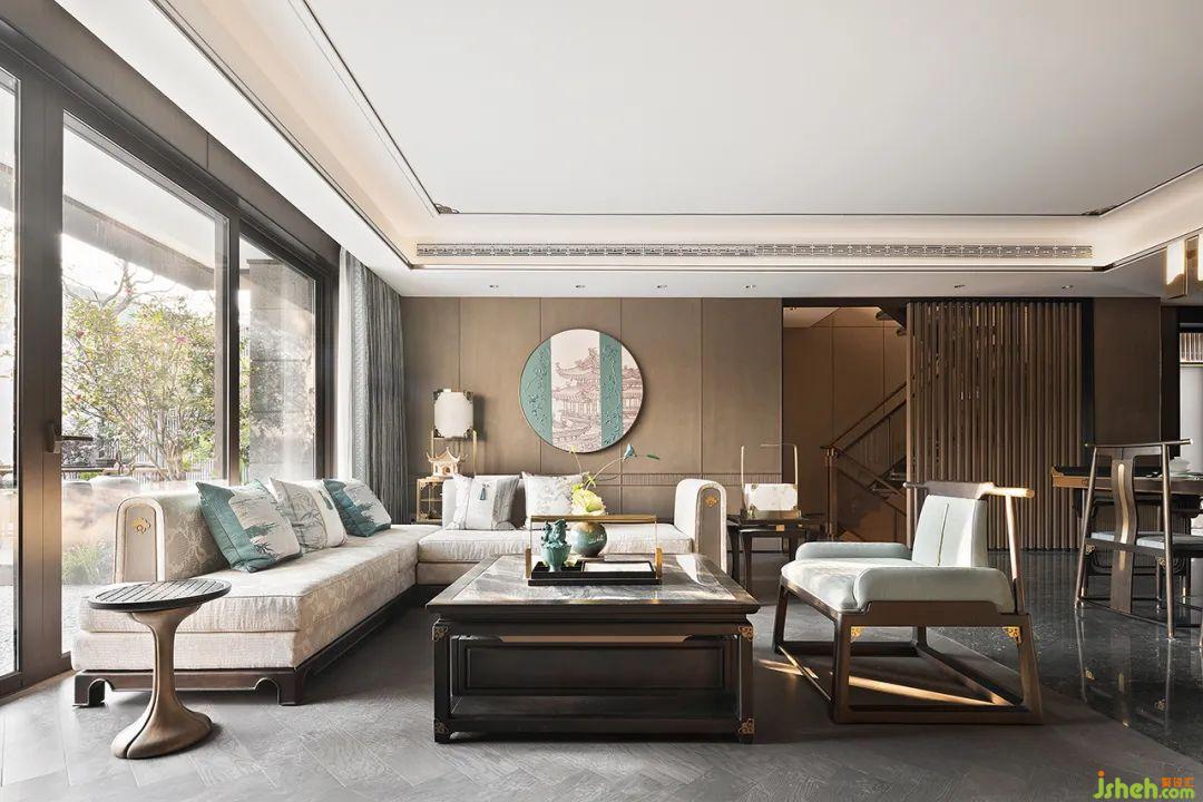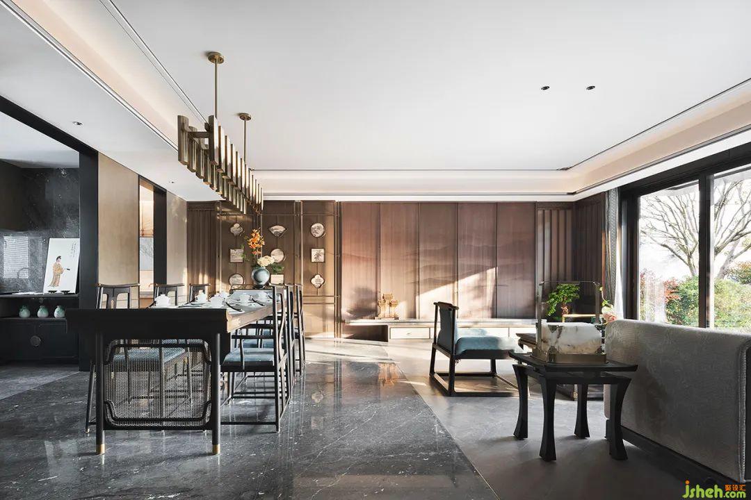 踏入室內(nèi),映入眼簾的是大幅飄窗打通室內(nèi)與戶(hù)外景致的視覺(jué)聯(lián)結(jié)使之更加開(kāi)敞,和煦日光,將清幽寫(xiě)意娓娓道來(lái)。室內(nèi)設(shè)計(jì)整體為王府中式設(shè)計(jì),不經(jīng)意間將生活、詩(shī),遠(yuǎn)方連成一體,召喚每一位歸家的人。室內(nèi)整體采用中式元素融入考究而克制的細(xì)節(jié),客廳背景金屬網(wǎng),在里面加上了一副娟絲雕刻的山水畫(huà),其滲透出的遠(yuǎn)山層疊與金屬質(zhì)感的動(dòng)靜相襯,賦予流動(dòng)的語(yǔ)言,增添不同層次的感官體驗(yàn),讓其形成虛與實(shí)的中式意境。