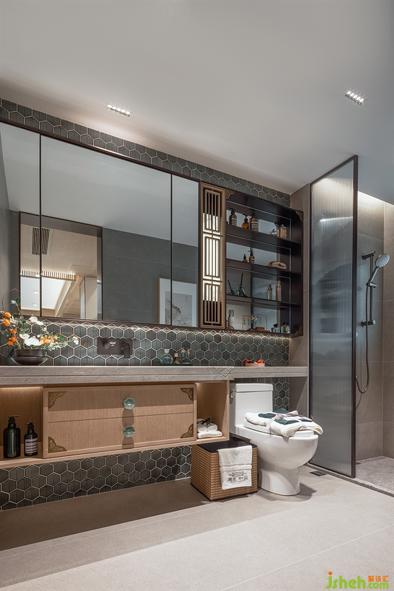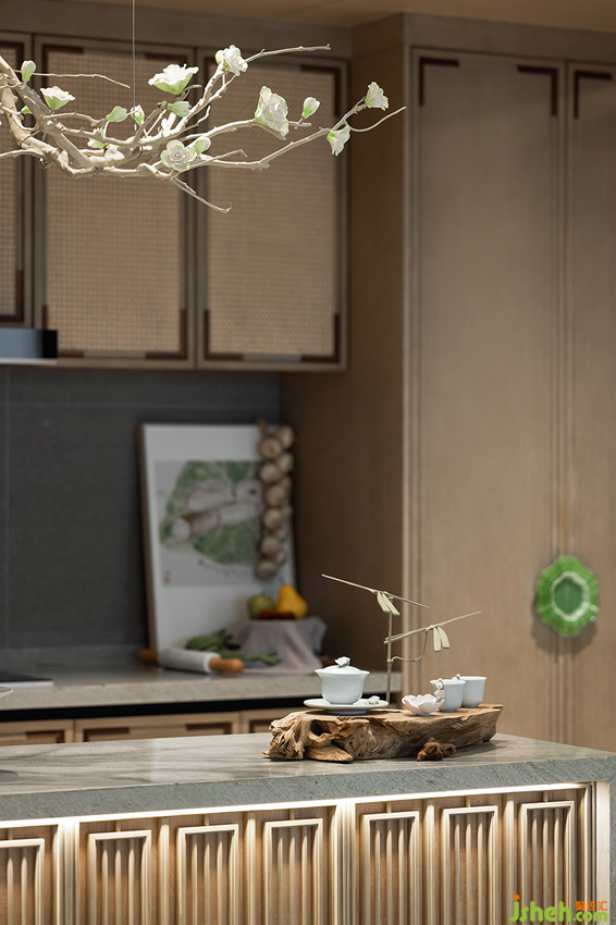 入戶玄關與廚房借鑒中式園林的透景,利用格柵打破以往室內空間格局,豐富層次,以“虛”對比“實”的存在,形而悅影,以影傳神。