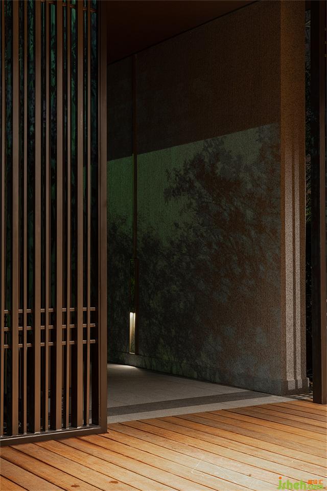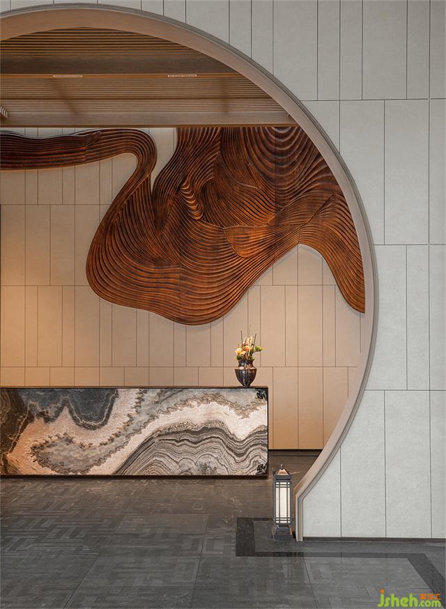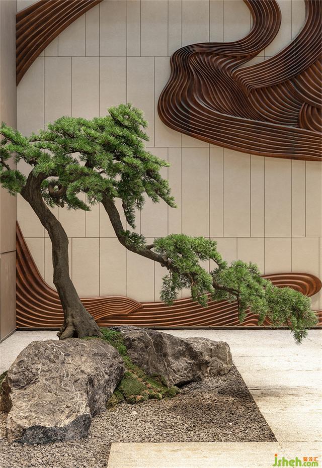 月洞門圓潤(rùn)如月,暗含九九歸一寓意圓滿之意。營(yíng)銷中心設(shè)計(jì)師運(yùn)用黃金分割的手法將月洞門與整個(gè)墻體的內(nèi)面進(jìn)行組合、切割,以虛實(shí)結(jié)合的手法營(yíng)造一個(gè)半圍合的空間,讓靜止的空間內(nèi)充滿靈動(dòng)的柔美。一枝松枝橫斜,樹影婆娑構(gòu)出“明月松間照”的詩意畫面。