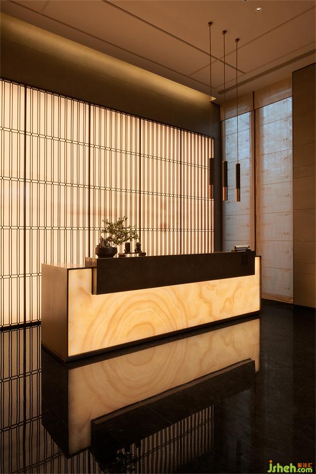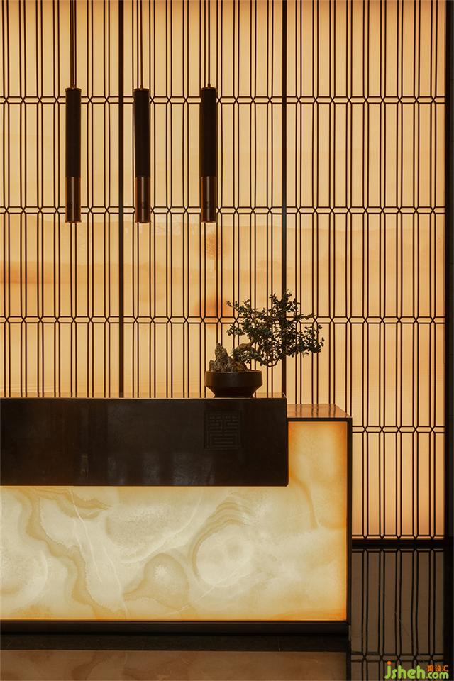 步入接待廳,格柵屏風(fēng)滲透出影綽的遠(yuǎn)山層疊與水紋肌理的臺面動靜相襯,營銷中心設(shè)計(jì)賦予流動的語言,增添不同層次的感官體驗(yàn)。游走于空間線條之中,無限延伸、擴(kuò)展空間與藝術(shù)交織后呈現(xiàn)詩意氛圍。