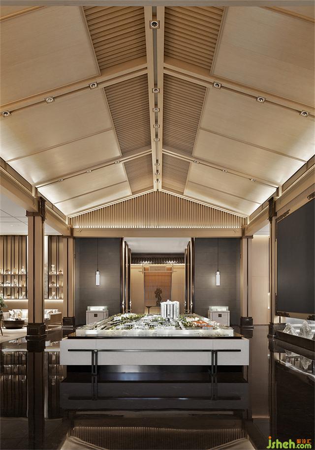 沙盤區(qū)上方采用中國傳統(tǒng)的坡屋頂元素,用現(xiàn)代手法進(jìn)行重構(gòu),營銷中心設(shè)計(jì)展現(xiàn)了傳統(tǒng)與現(xiàn)代設(shè)計(jì)的共鳴,創(chuàng)造出一種包含著能量的“場域”。