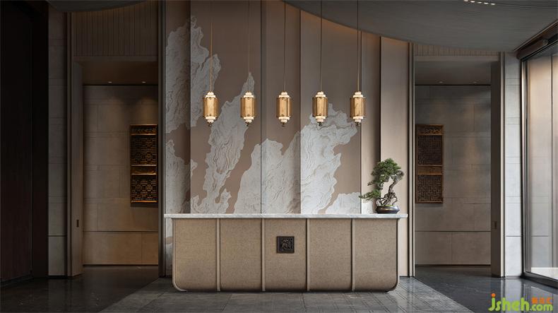 售樓處接待廳背景墻設(shè)計提取水浪流動的形態(tài)內(nèi)置于格柵空間當(dāng)中,會所設(shè)計水浪翻流沖突的水花以及接待臺大理石如水般肆意流淌的水波紋仿佛要掙脫空間界定的桎梏,恰到好處地表現(xiàn)出空間的視覺張力。