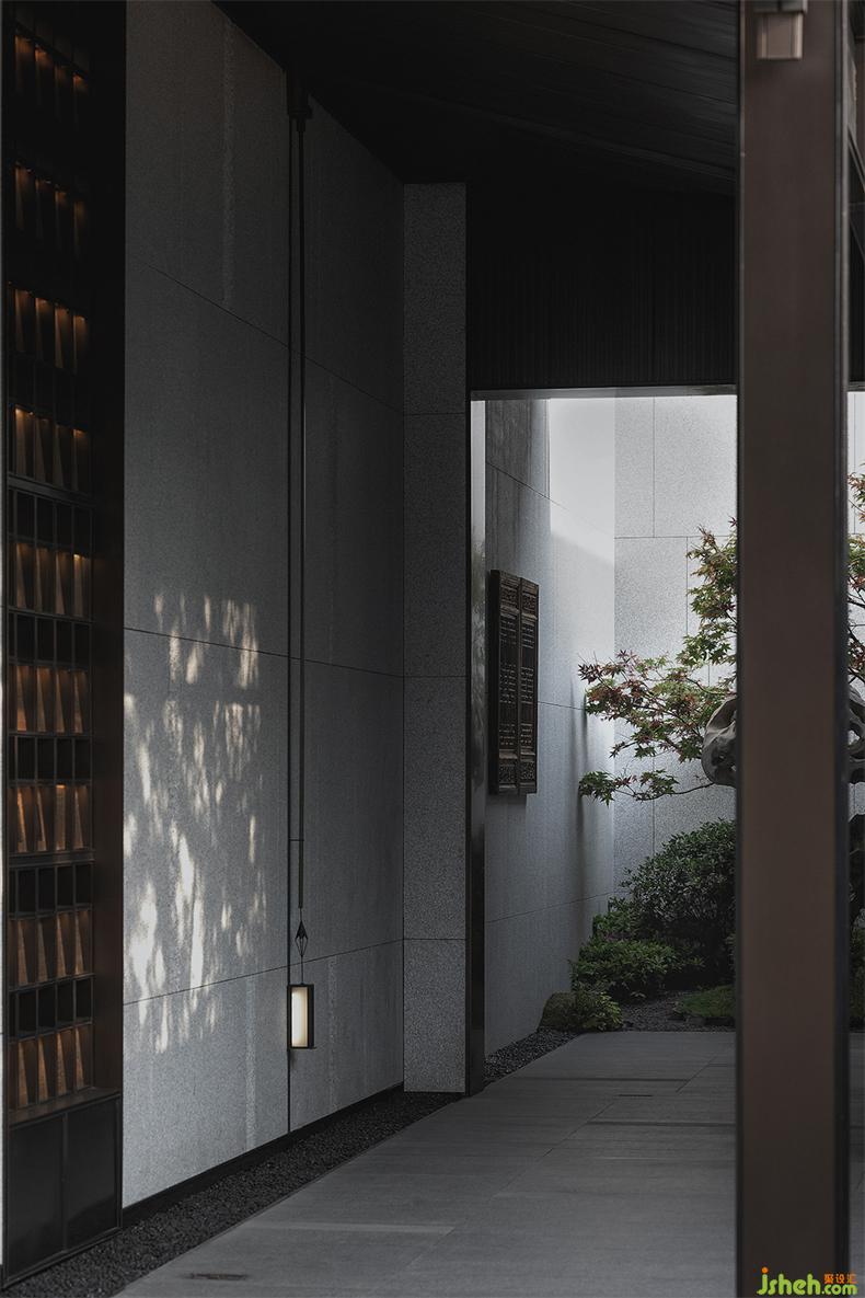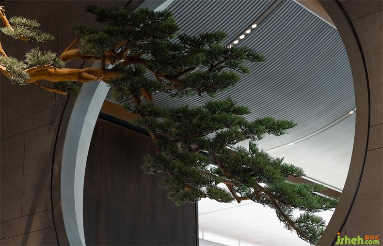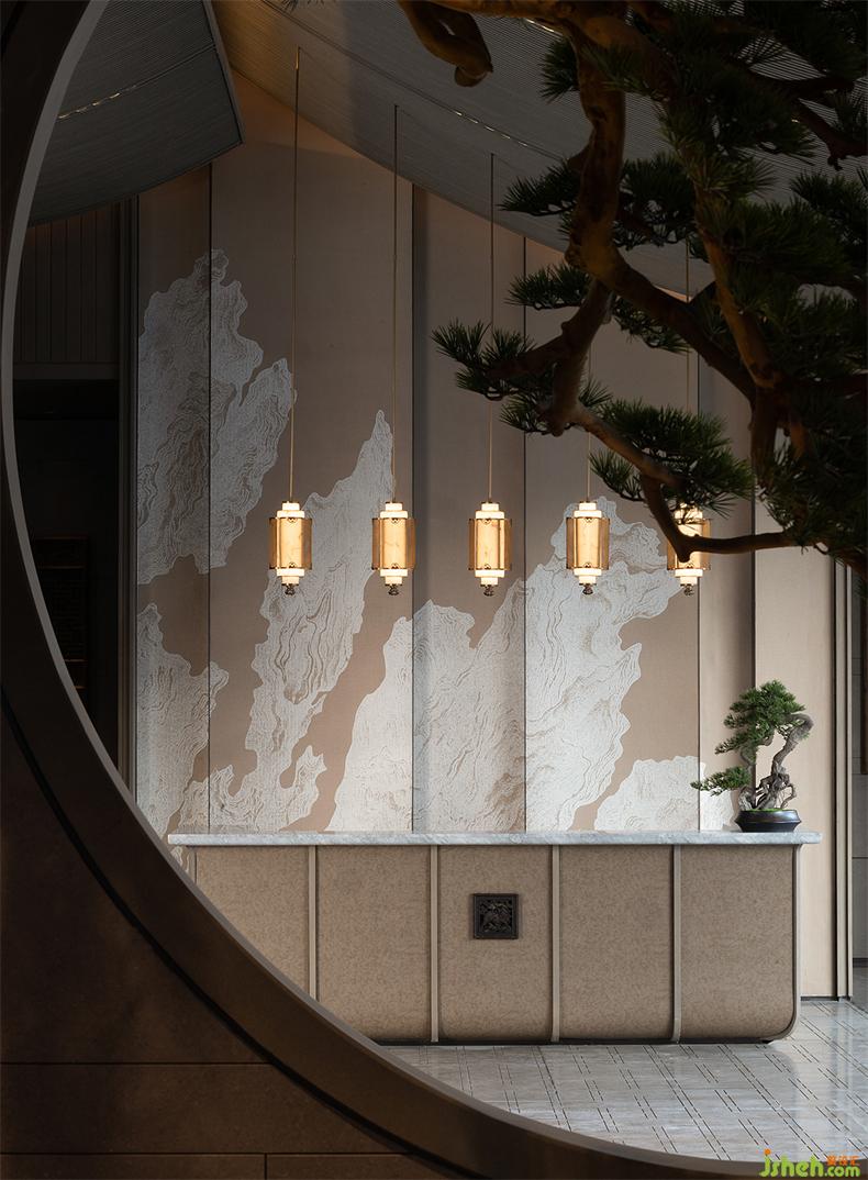 前臺一側(cè),會所設(shè)計以虛實結(jié)合的手法營造一個半圍合的空間,一方池水,鏡面澄澈,一枝松枝橫斜,樹影婆娑,一池一樹一景,二維畫卷與三維微觀園林水景互為映照,形構(gòu)出靜謐空間氣質(zhì)。
