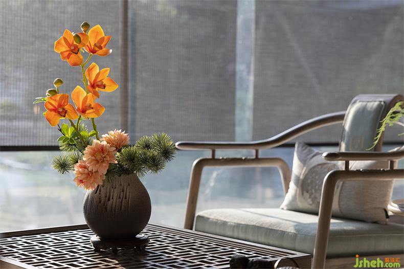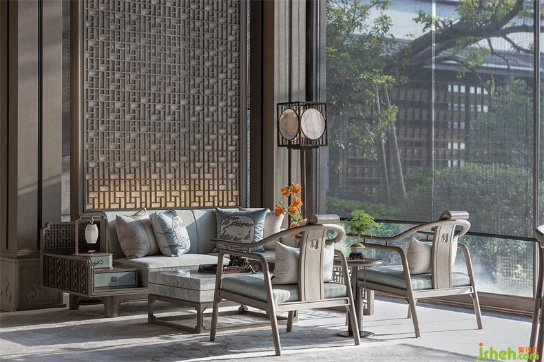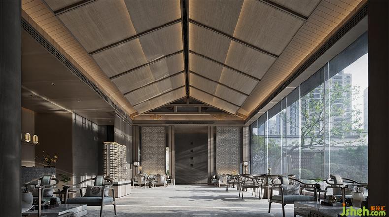 洽談區(qū)的設計延續(xù)了東方的禮序之美,對稱布局,一面是開闊的園林叢林景色,一面是豐沛的情境體驗,共生平衡與和諧。會所設計天花以徽派傳統(tǒng)建筑結構為原型,令空間多了些山峰傲骨的巍然氣韻。