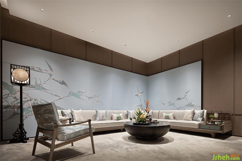 水吧臺的墻面以門窗取景,與背景水墨畫間相呼應,呈現(xiàn)“檐飛苑溪水,窗落敬山亭出”的寫意畫卷,會所設計搭配宋代中式簡約的家具,令整體空間在統(tǒng)一和諧的基調中,散發(fā)出大氣穩(wěn)重的觀感。