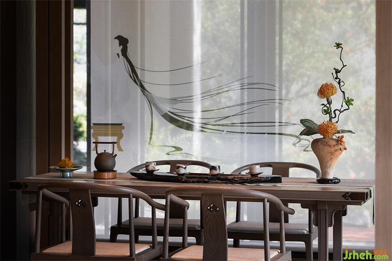 洽談區(qū)的設(shè)計(jì)延續(xù)了空間的禮序之美,搭配宋式家具,營造家的真實(shí)感受和舒適商談氛圍,室內(nèi)設(shè)計(jì)師光影交錯下,一面是開闊的園林叢林景色,一面是豐沛的情境體驗(yàn),共生平衡與和諧。