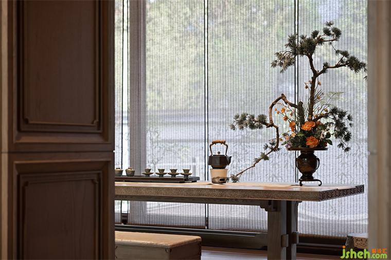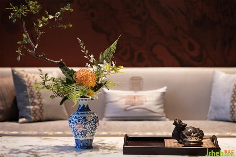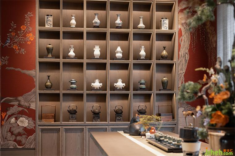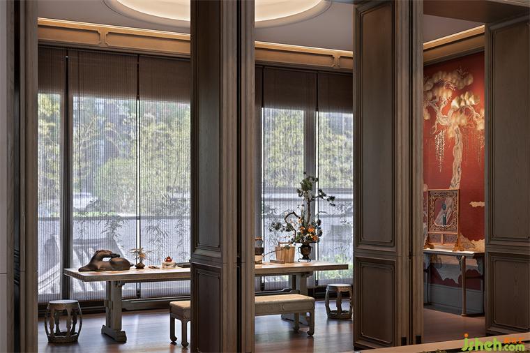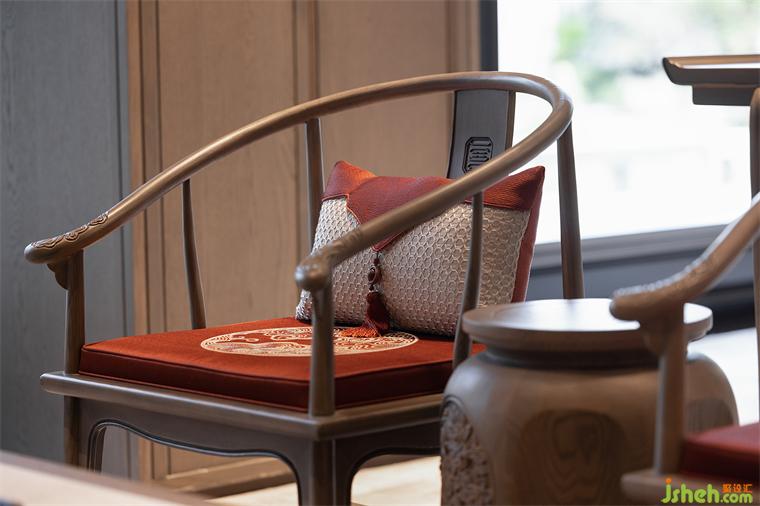 洽談區(qū)的設(shè)計延續(xù)了空間的禮序之美,搭配宋式家具,長沙會所設(shè)計營造家的真實感受和舒適商談氛圍,光影交錯下,一抹中國紅的柜體,作為跳躍色點燃空間情緒,傳達著當(dāng)代中式美學(xué)的奢華。