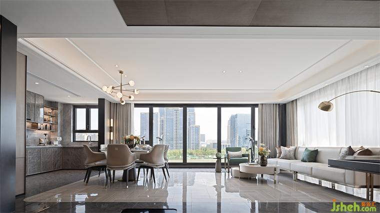 客廳布局打破常規(guī)的空間界限,樣板房設計強調(diào)空間線條感與生活功能性的思考,客廳、餐廳與工作區(qū)融合實現(xiàn)多場景對話打造生活空間,以連貫的手法和語言造型呈現(xiàn),向內(nèi)外延伸。開放式的格局,讓空間更為寬敞通透,營造舒展的氛圍。